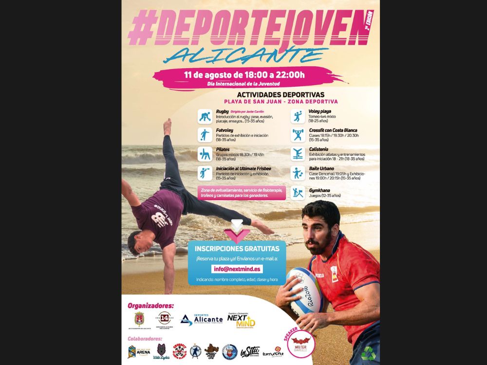 En la segunda edición de Deporte Joven, celebrada en la Playa de San Juan, organizamos una amplia programación de actividades deportivas para jóvenes de entre 15 y 35 años. El evento tuvo repercusión en medios de comunicación, destacando su impacto y alcance.